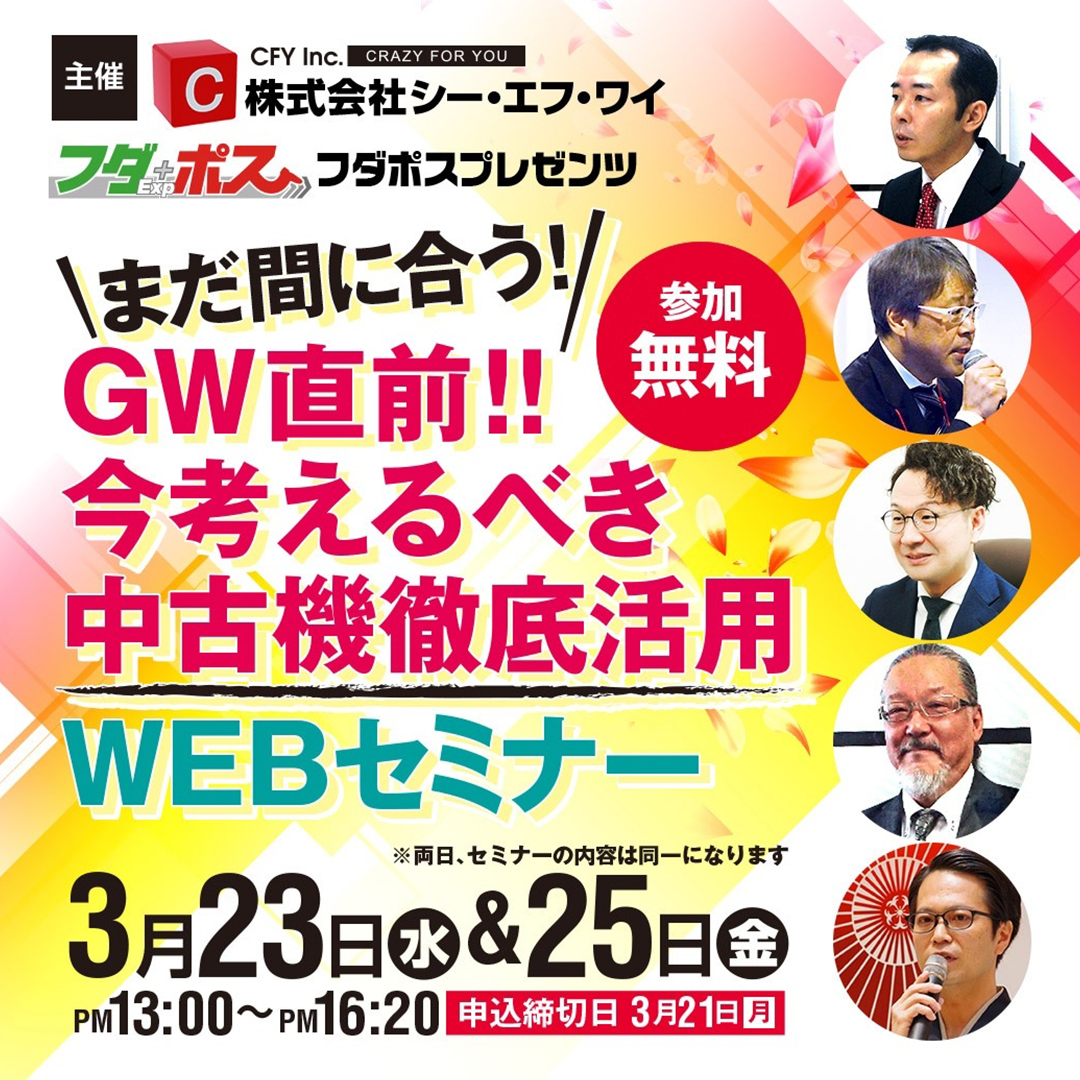 3月23日(水)3月25日(金)、株式会社シー・エフ・ワイ様主催の『まだ間に合う、GW直前!! 今考えるべき中古機徹底活用 WEBセミナー』で講演させていただく運びとなりました。
